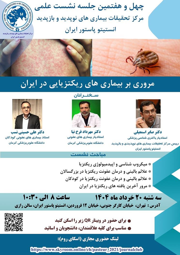 به اطلاع می رساند چهل و هفتمین نشست علمی مرکز تحقیقات بیماری های نوپدید و بازپدید انستیتو پاستور ایران با موضوع مروری بر بیماریهای ریکتزیایی در ایران، در تاریخ سه شنبه ۱۴۰۴/۰۳/۲۰ از ساعت ۸:۰۰ لغایت ۱۰:۳۰ در محل سالن رازی انستیتو پاستور ایران برگزار خواهد شد. شایان ذکر است که جلسه بصورت حضوری و آنلاین برگزار خواهد شد و برای افراد شرکت کننده بصورت حضوری گواهی شرکت در نشست علمی صادر خواهد شد