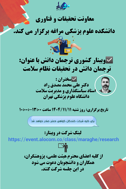 به اطلاع کلیه پژوهشگران می رساند دانشکده علوم پزشکی مراغه در نظر دارد وبینار کشوری ترجمان دانش در تحقیقات سلامت را برگزار نماید.